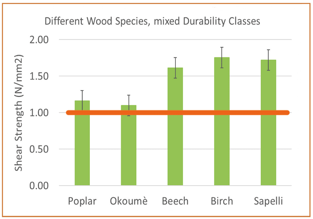 I dati, ottenuti da oltre 260 prove condotte in differenti condizioni di pressatura, confermano un’elevata e costante resistenza del giunto incollato, la quale risulta positivamente correlata alla densità e alla resistenza del legno impiegato. La prova di ‘taglio per rotolamento’, eseguita su campioni umidi, considera accettabili i risultati quando la resistenza a taglio supera 1 N/mmÇ, rendendo non necessaria un’ulteriore analisi di rottura del legno.