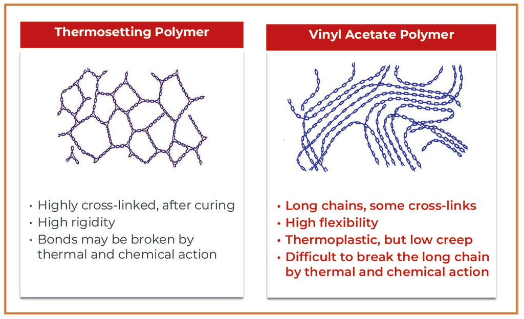 Le ragioni di tali vantaggi risiedono nella natura fisico-chimica intrinseca degli adesivi filmogeni pre-polimerizzati, in contrasto con i tradizionali adesivi termoindurenti polimerizzati in situ, nonché nella quasi centenaria esperienza di Vinavil nella loro formulazione.