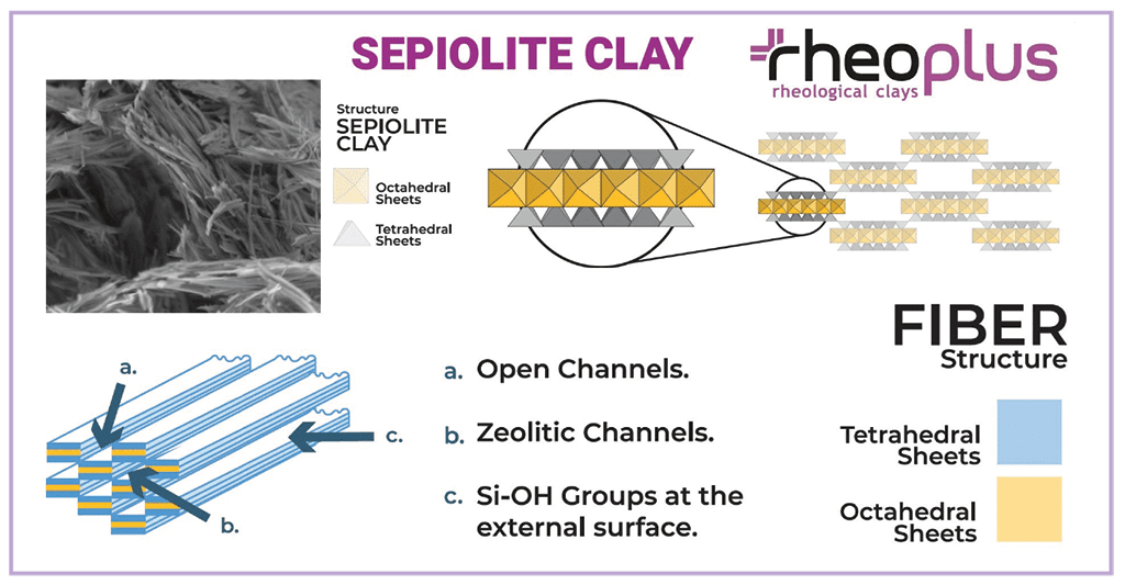 Il suo meccanismo di inspessimento è principalmente meccanico, basato sull’intreccio fisico delle fibre, rinforzate dalle interazioni dei legami idrogeno fra loro, che migliorano la stabilità e la tenacità del reticolo. Diversamente dalla bentonite, la sepiolite non rigonfia in modo significativo, al contrario assorbe l’acqua nei canali microporosi della propria struttura.