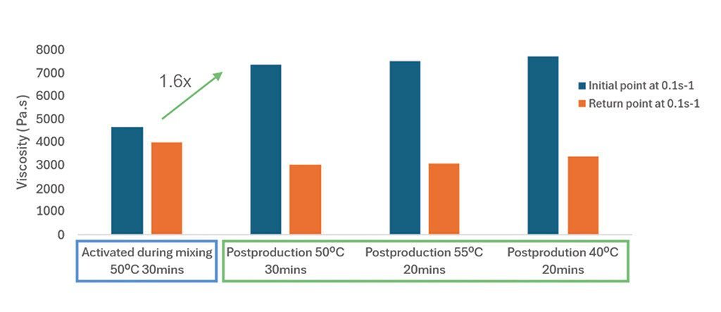 • L’attivazione post-produzione produce una viscosità iniziale più elevata rispetto all’attivazione durante il processo, ma i valori della viscosità convergono dopo 1-2 settimane ai 50° C della temperatura di stoccaggio.