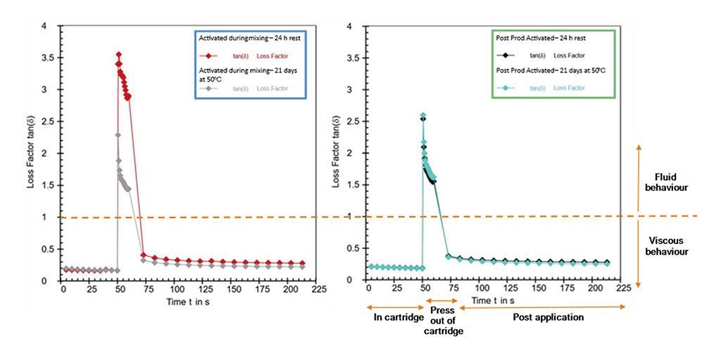 È stato misurato nel tempo il fattore di perdita (tan(δ), per simulare la transizione dallo stoccaggio nella cartuccia, passando per l’estrusione fino al termine dell’applicazione e dopo. I due metodi di attivazione durante il processo e post produzione sono stati valutati ogni 24 ore e dopo 21 giorni della durata dello stoccaggio a 50°C. I risultati dimostrano un effettivo recupero e una risposta della viscosità stabile per entrambe le tecniche, a supporto dell’efficacia dell’attivazione post-produzione (Fig. 3).