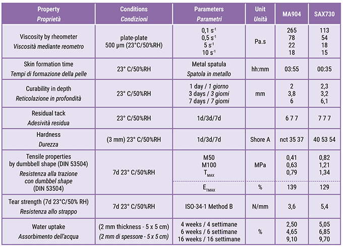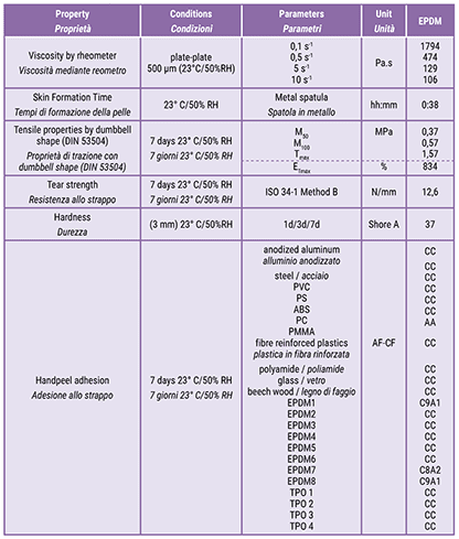 The properties of an EPDM and TPO adhesive based on Kaneka SilylTM SAX220, when combined with specific raw materials, allow adhesion to most commercially available EPDM membranes. Table 2 provides further details.